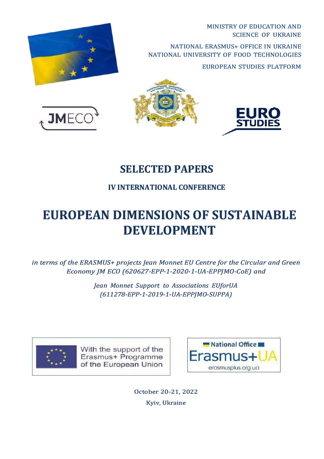Summary: Selected papers of the IV International Conference on European Dimensions of Sustainable Development present abstracts of the reports of the conference, which had place on October 20-21, 2022 at National University of Food Technologies, Kyiv, Ukraine (online) in terms of the ERASMUS+ projects Jean Monnet EU Centre for the Circular and Green Economy JM ECO (620627-EPP-1-2020-1-UA-EPPJMO-CoE) and Jean Monnet Support to Associations EUforUA (611278-EPP-1-2019-1-UA-EPPJMO-SUPPA). Scientific articles cover economic, environmental and social aspects of sustainable development of European Union and Ukraine, russian invasion of Ukraine as the threat of European sustainability; as well as European Studies on the sustainable development.