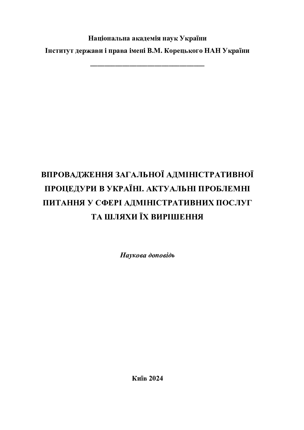 Впровадження загальної адміністративної процедури в Україні. Актуальні проблемні питання у сфері адміністративних послуг та шляхи їх вирішення : наукова доповідь